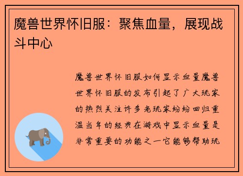 魔兽世界怀旧服:聚焦血量,展现战斗中心